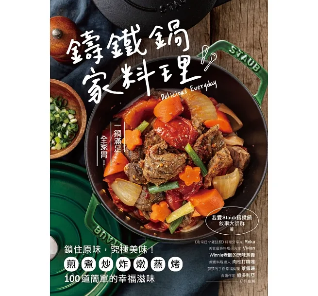 帶你活用鑄鐵鍋「快速導熱」、「蓄熱佳」、「鎖住食材原味」的多功能特性,用一口鍋,端出全家都愛吃的配菜、主食、湯品、鍋物、甜點;用一口鍋,做出一道又一道,簡單卻最溫暖的幸福滋味!